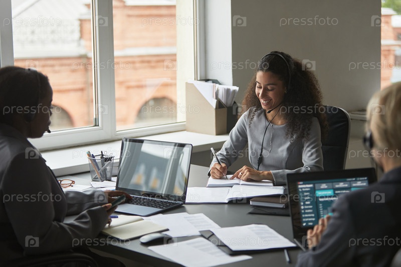Мультиэтнические женщины сотрудничают в офисе, нося гарнитуры