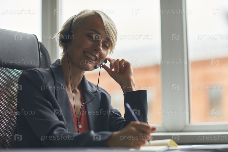 Женщина средних лет улыбается, делая заметки во время видеозвонка