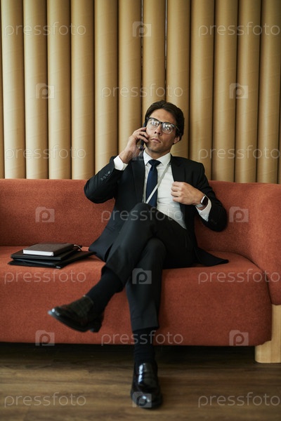 Молодой бизнесмен сидит на диване и разговаривает со смартфоном в офисе