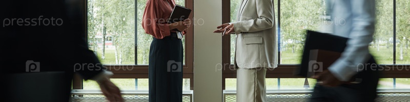 Две бизнес-женщины обсуждают проблемы на работе в коридоре