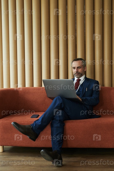 Мужчина средних лет сидит на диване, используя ноутбук для удаленной работы