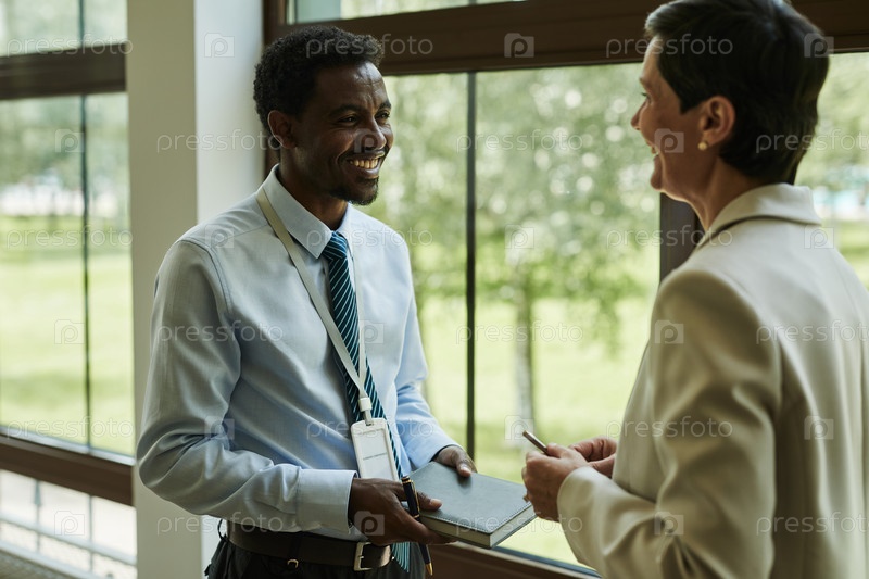 Различные деловые люди разговаривают у окна офиса