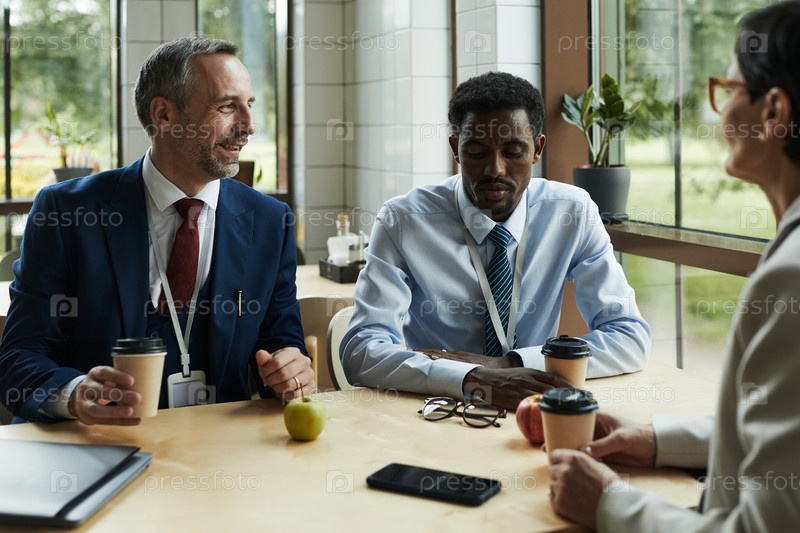 Мужчины среднего возраста и чернокожие обсуждают бизнес с коллегой