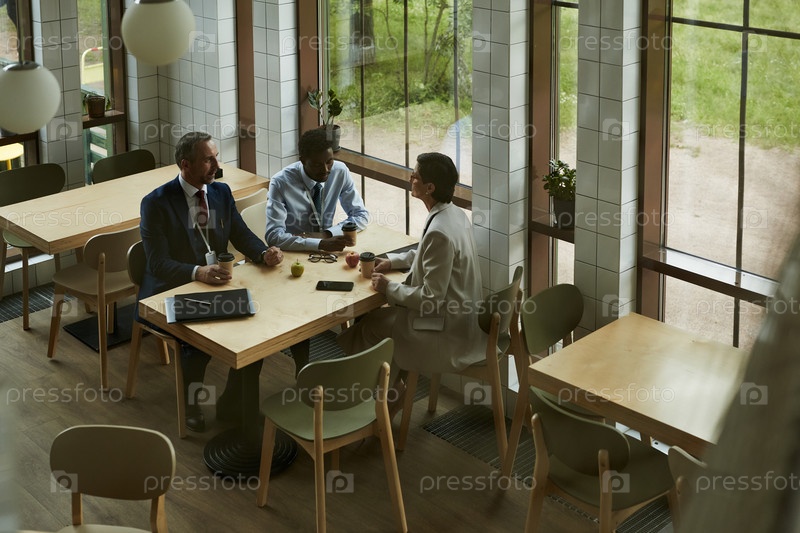 Группа деловых людей обсуждают проект в современном кафе