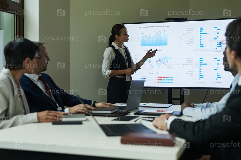 Молодая женщина представляет бизнес-данные различным коллегам