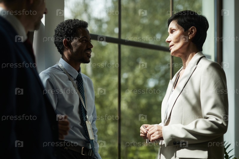 Женщина средних лет и чернокожий мужчина ведут серьезный деловой разговор
