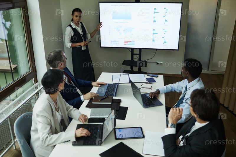 Мультиэтническая группа бизнесменов среднего возраста, анализирующих данные во время встречи