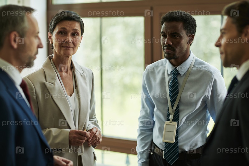 Женщина среднего возраста и различные коллеги обсуждают бизнес-стратегию