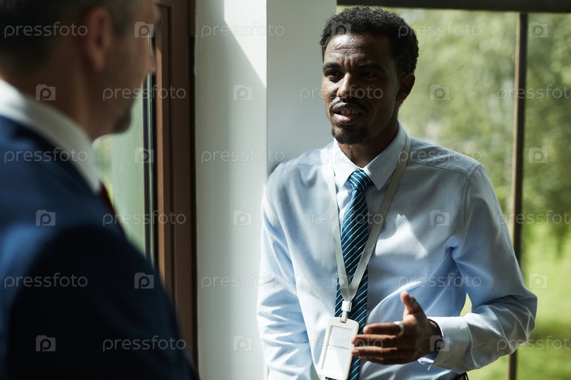 Молодой чернокожий человек обсуждает бизнес-стратегию с коллегой