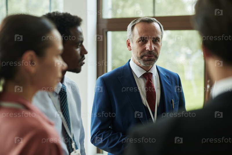 Мужчина средних лет ведет деловую встречу с различными коллегами