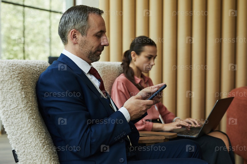 Мужчина средних лет использует смартфон рядом с молодой женщиной, работающей на ноутбуке