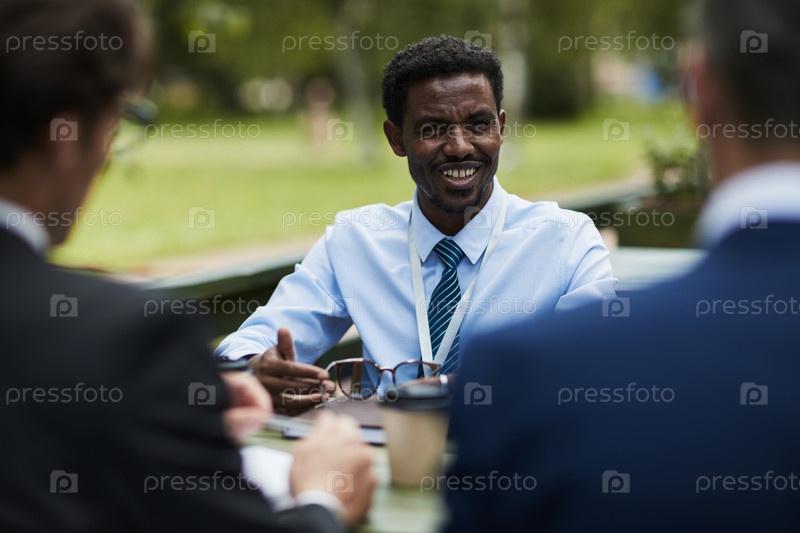 Молодой чернокожий мужчина улыбается, обсуждая деловые дела на открытом воздухе с коллегами