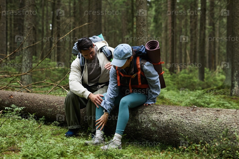 Молодой взрослый мужчина помогает молодой взрослой женщине с травмированной лодыжкой на открытом воздухе