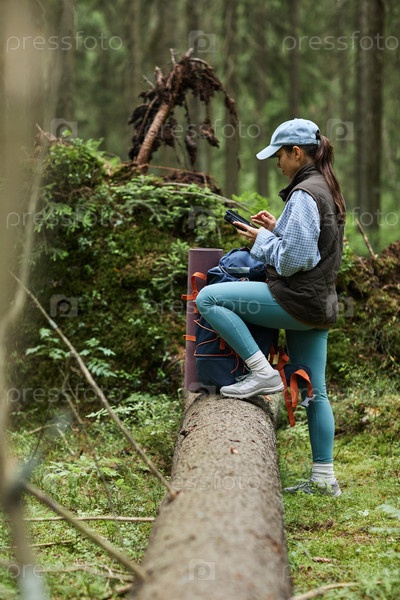 Молодая взрослая женщина использует смартфон во время прогулки по лесу на открытом воздухе
