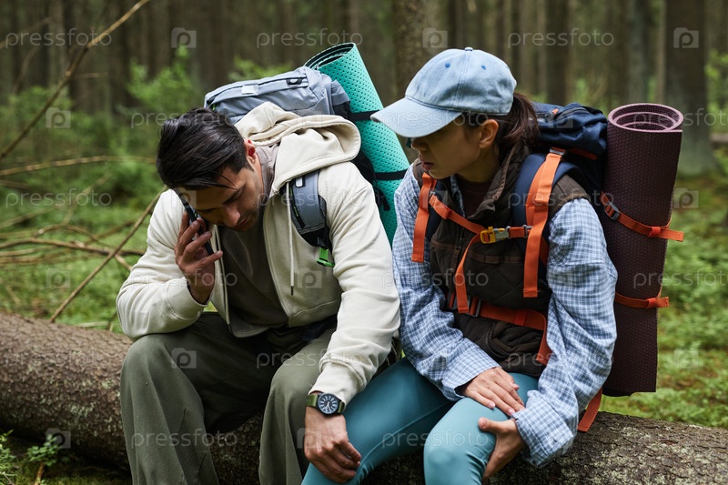 Молодой человек разговаривает по телефону, сидя с молодой азиатской женщиной на прогулке