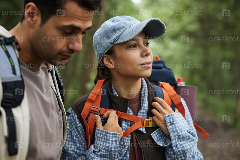 Молодая женщина и молодой человек вместе ходят по лесу на открытом воздухе