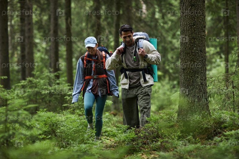 Молодой мужчина и женщина вместе ходят вдоль пышного зеленого леса