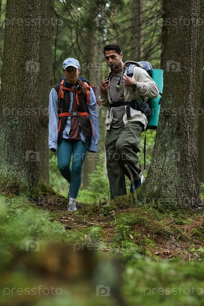 Молодой мужчина и женщина вместе ходят по лесной тропе во время похода
