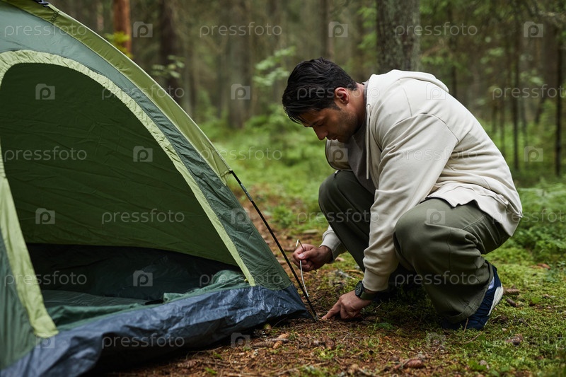 Молодой взрослый мужчина собирает палатку на открытом воздухе во время похода