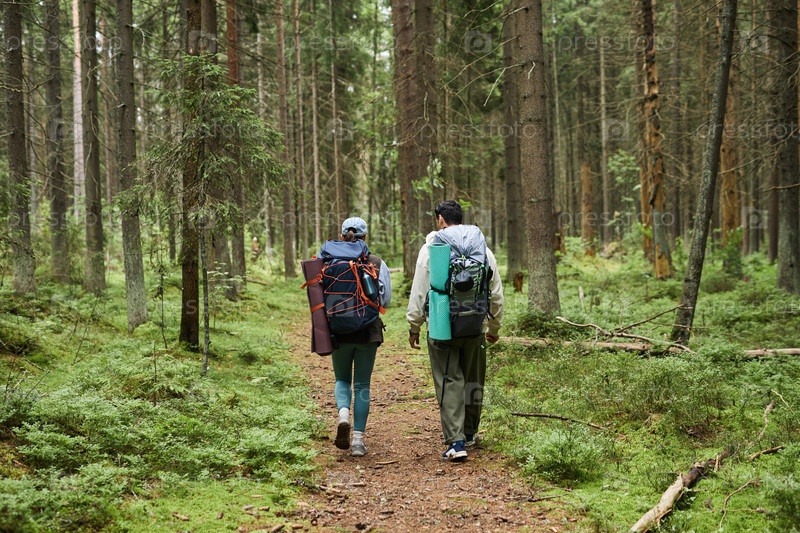 Молодая взрослая женщина и мужчина ходят по лесной тропе, неся рюкзаки
