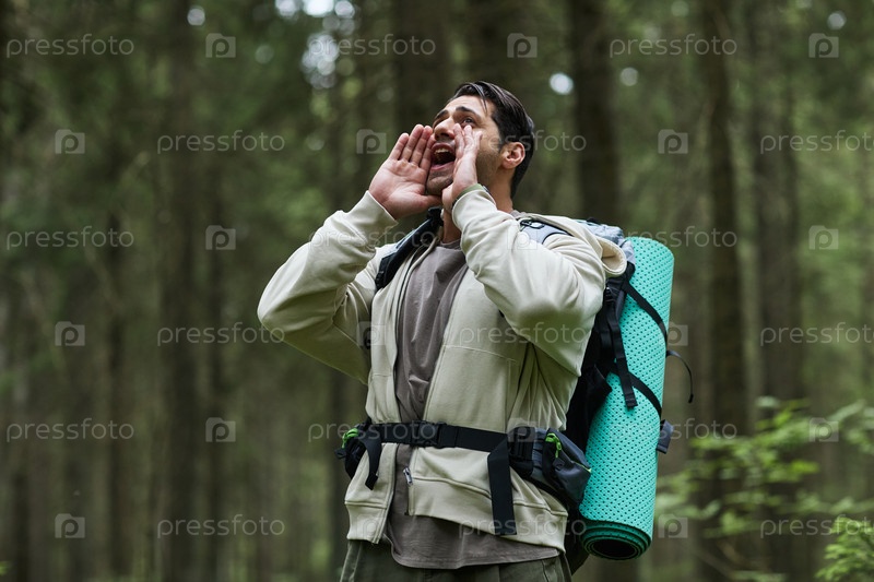 Молодой взрослый мужчина кричит, когда ходит в одиночку по лесной пустыне