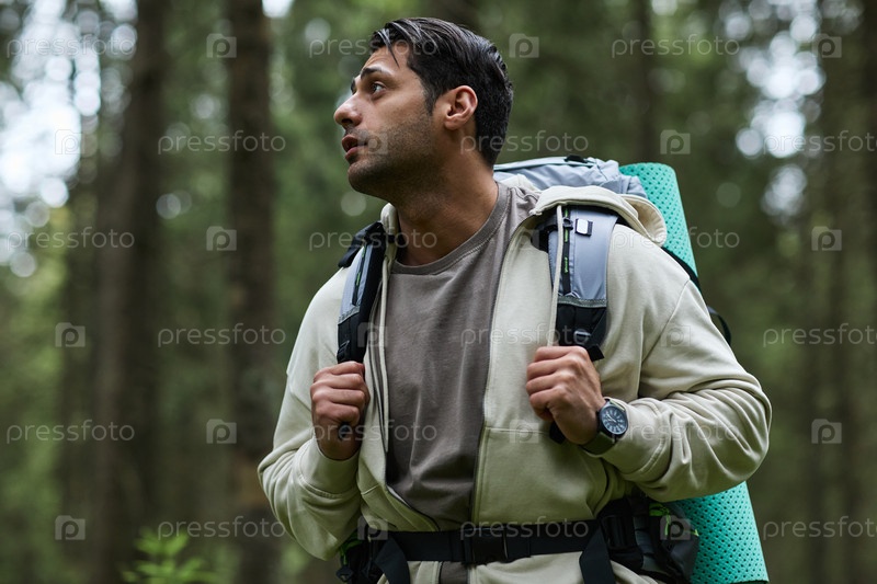 Молодой взрослый мужчина путешествует по лесу, неся рюкзак и смотря вверх