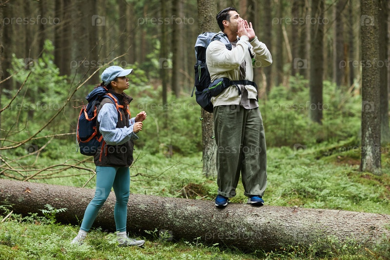 Молодой взрослый мужчина кричит, в то время как молодая женщина слушает во время прогулки по лесу