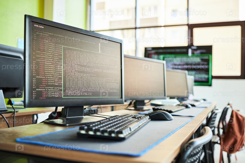 Ряд компьютерных мониторов, отображающих программный код в современном классе