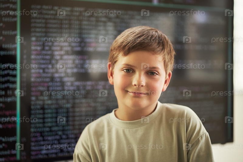 Портрет мальчика, улыбающегося перед экраном компьютера