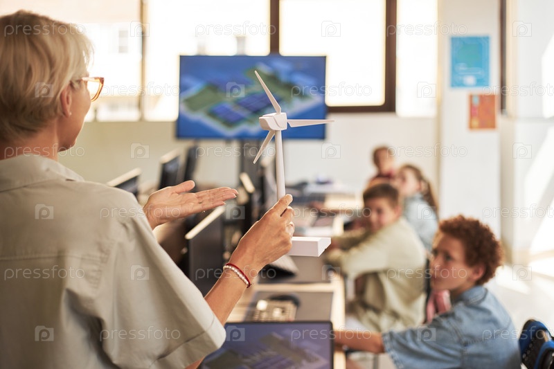 Женщина среднего возраста учит подростков о технологии ветровой энергии
