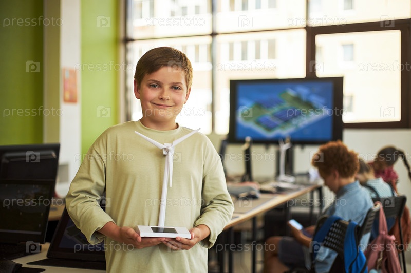 Мальчик представляет модель ветряной турбины во время школьного урока естествознания