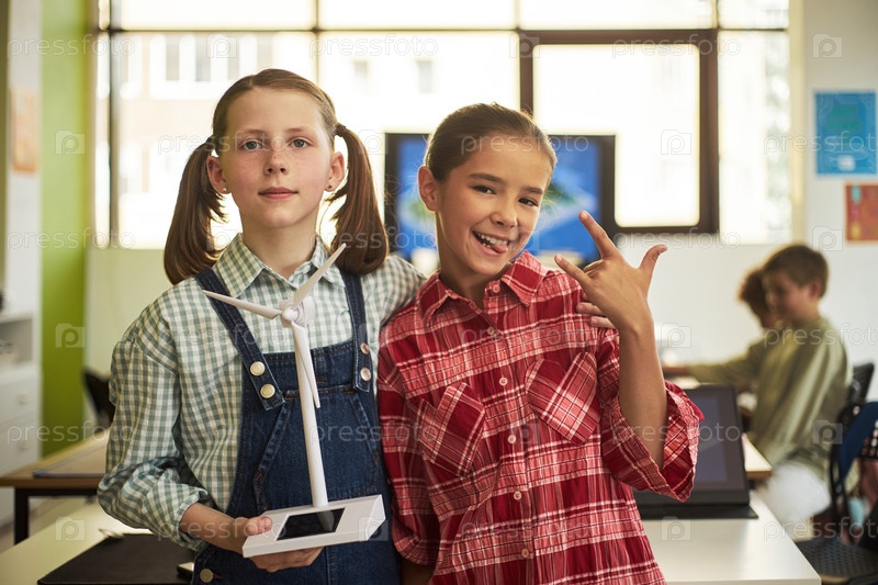 Две девочки улыбаются и позируют с моделью ветряной турбины в классе