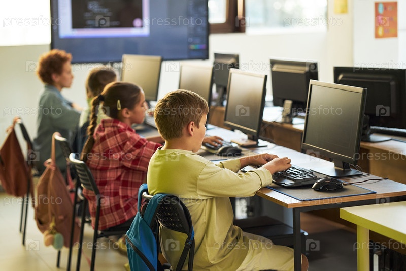 Группа детей, использующих настольные компьютеры в классной среде обучения