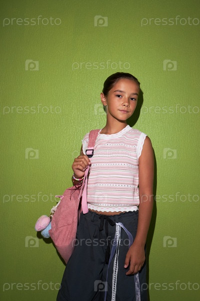Портрет девочки-подростка, стоящей на зеленой стене с рюкзаком в руках