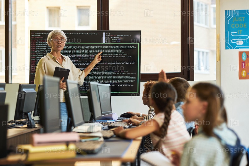 Старшая женщина преподает программирование различным группам детей в классе