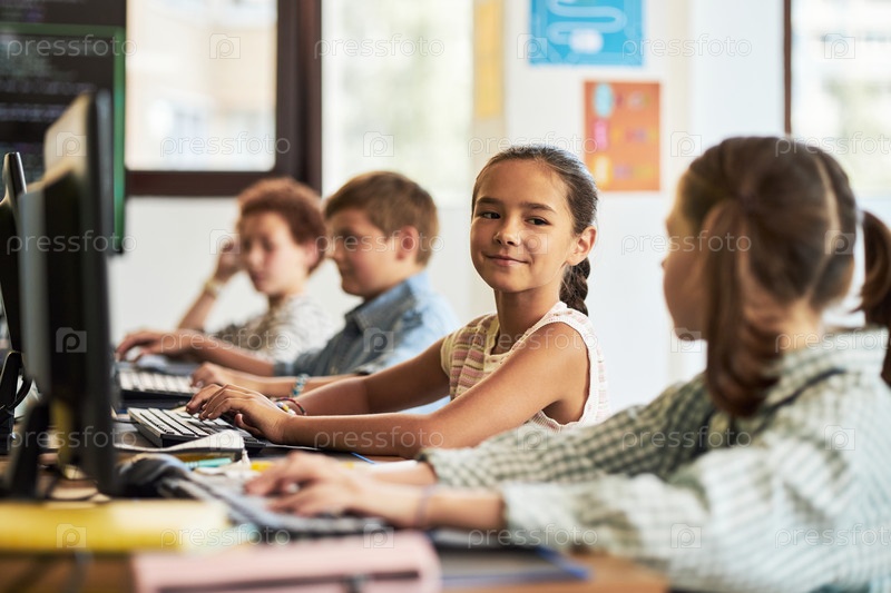 Девочка-подросток сотрудничает со своими одноклассниками, используя компьютеры в классе