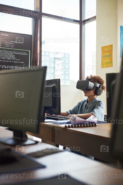 Молодая взрослая чернокожая женщина использует гарнитуру виртуальной реальности во время программирования в офисе