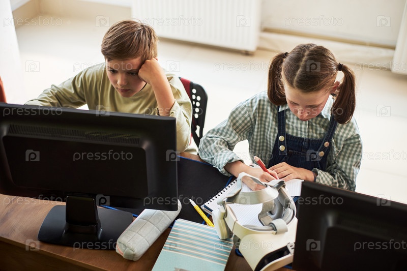Мальчик и девочка-подросток учатся вместе, используя компьютер и письмо