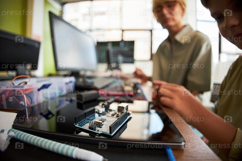 Женщина, направляющая ребенка программирование микроконтроллер в современном классе