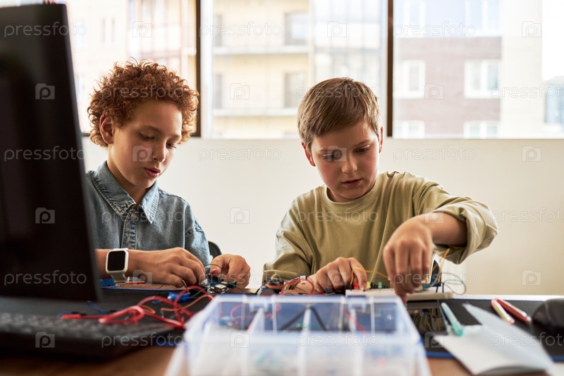 Двенадцатилетние мальчики сотрудничают над проектом по электронике в классной обстановке