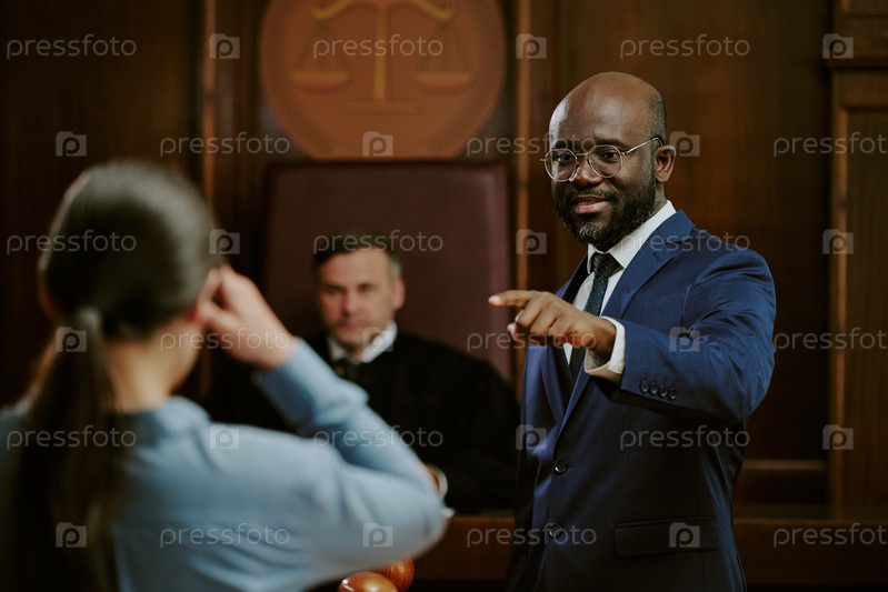 Чернокожий мужчина среднего возраста допрашивает молодую женщину во время судебного процесса