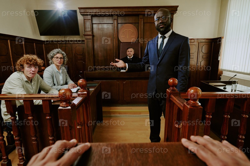 Чёрный мужчина среднего возраста представляет юридические аргументы в зале суда