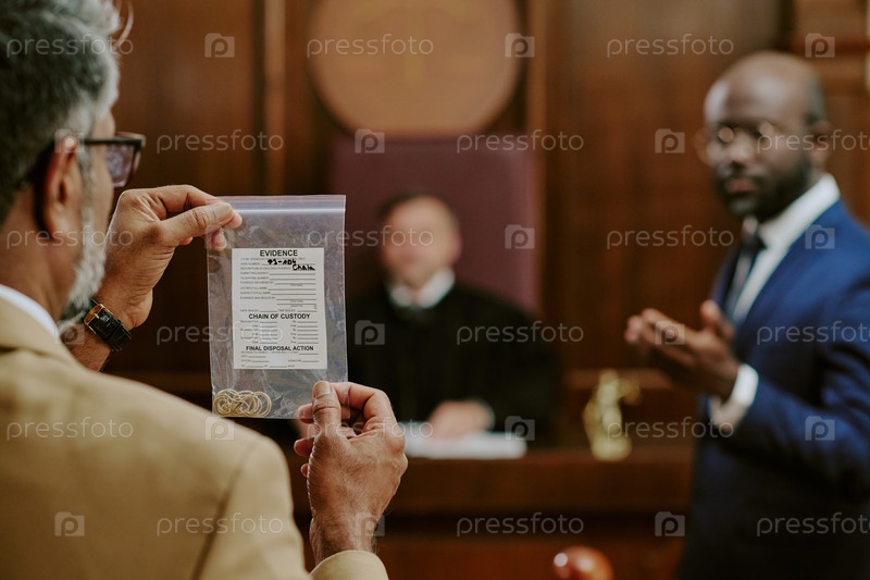 Мужчина среднего возраста представляет сумку с доказательствами во время судебного процесса