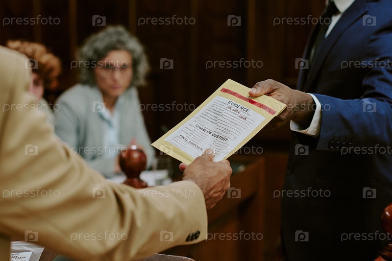 Мужчина средних лет вручает черному человеку в зале суда конверт с доказательствами