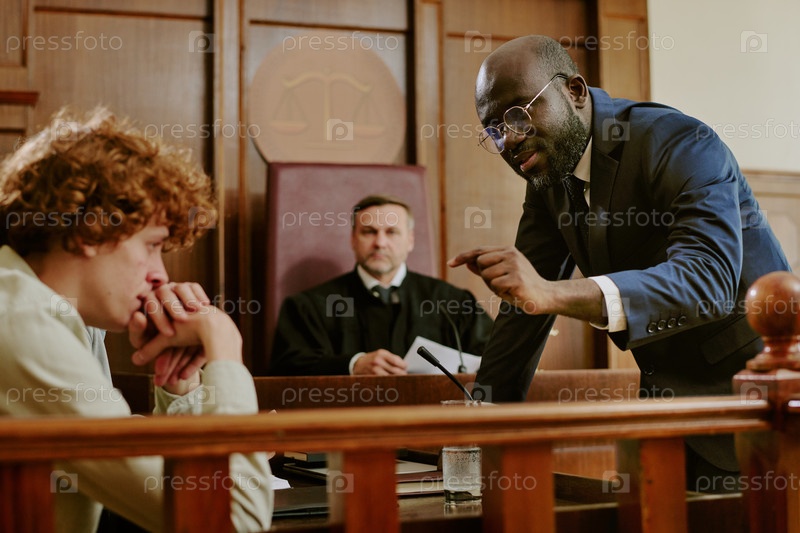 Чернокожий мужчина средних лет допрашивает подростка в зале суда