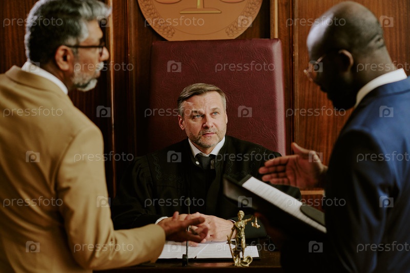Судья среднего возраста слушает адвокатов, спорящих в зале суда