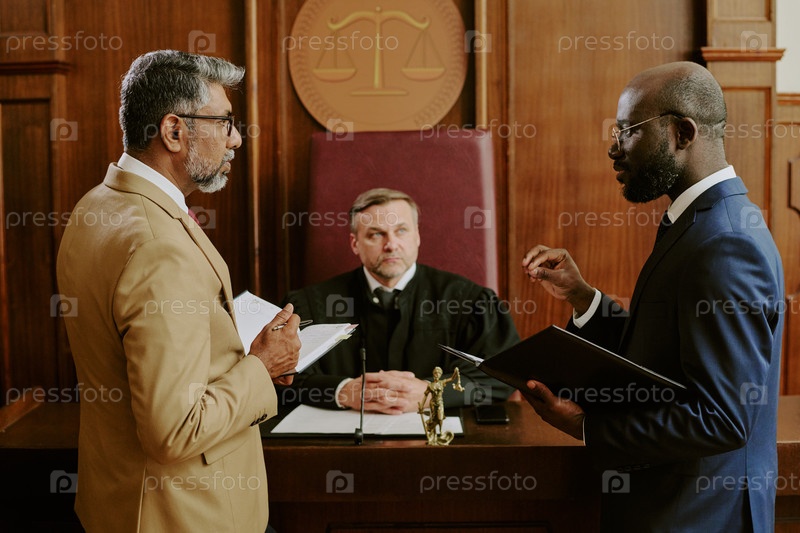 Судья среднего возраста наблюдает, как адвокаты обсуждают дело в зале суда