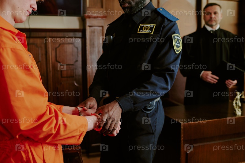 Чернокожий мужчина-офицер по охране наручников молодой взрослый в зале суда