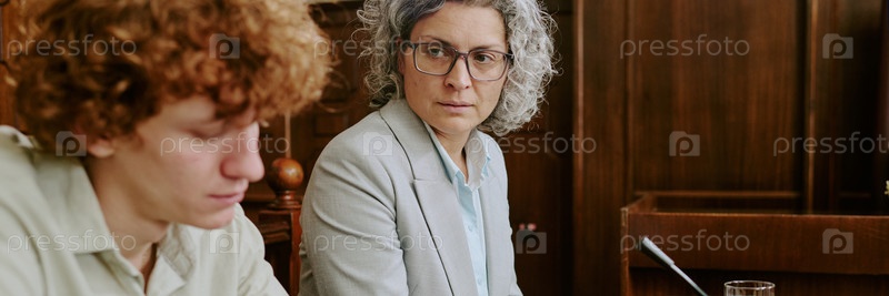 Женщина среднего возраста наблюдает за подростком во время судебного слушания