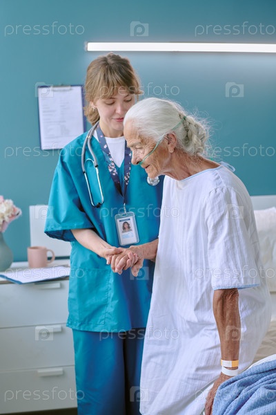 Женщина-медсестра помогает старшему человеку женщина стоит в больничной комнате